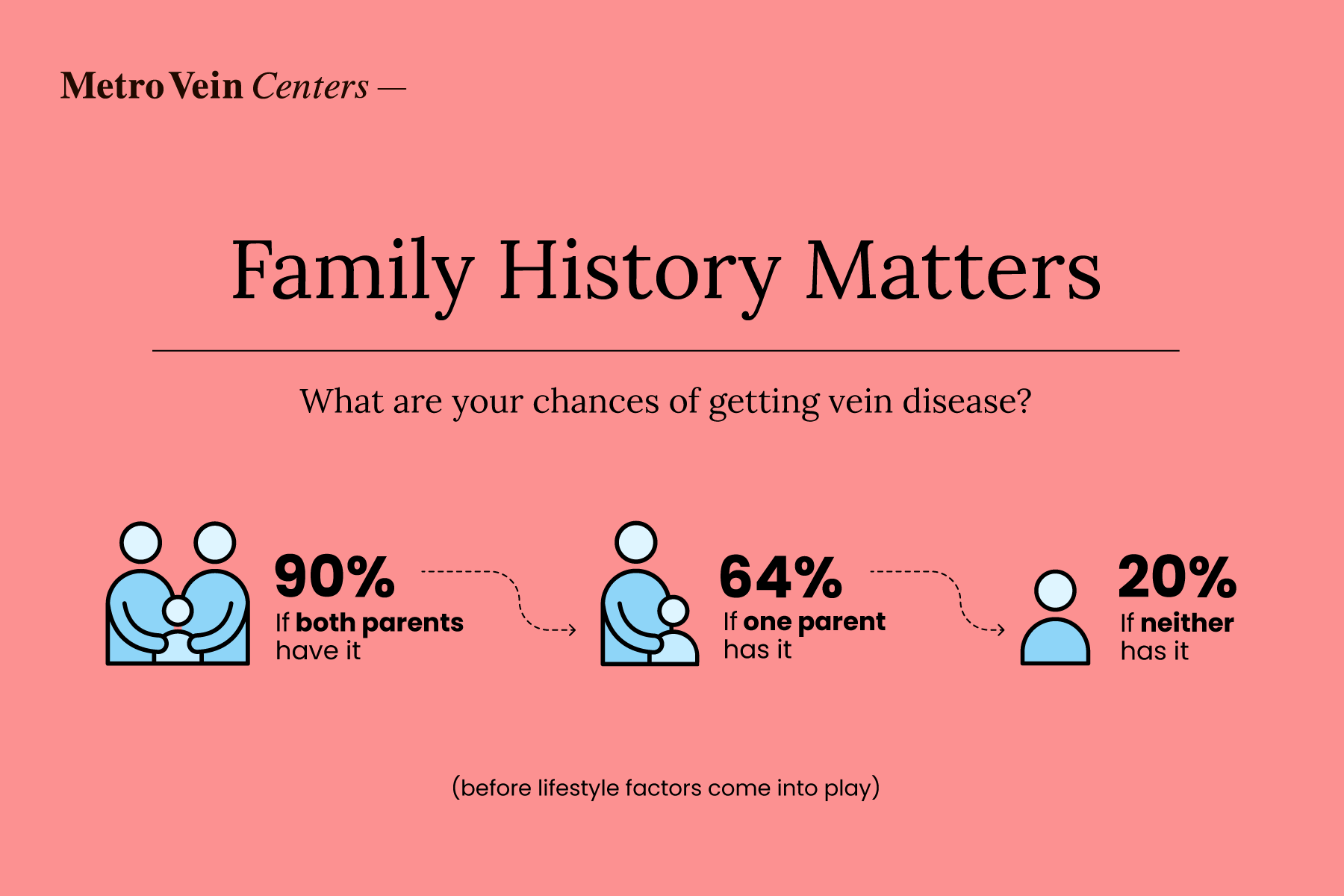 It's common to observe similar venous diseases within families, suggesting a strong genetic component. If you have a close relative that has experienced varicose veins or CVI, you may be at an increased risk. According to a study by Cornu-Thenard et al, if one parent has varicose veins, your risk of developing the condition may be as high as 64%. If both parents have varicose veins, your risk of developing them could be as much as 90%. If neither of your parents developed varicose veins, your baseline risk is still around 20%.