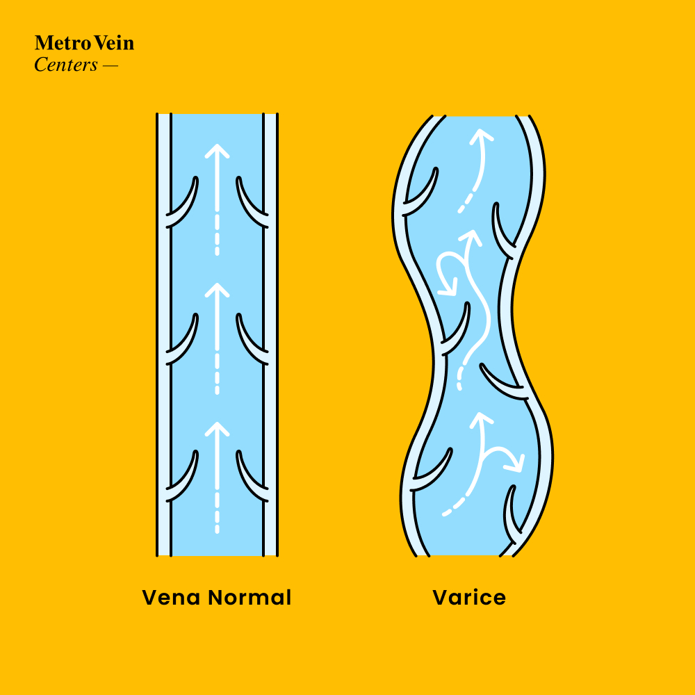 Las varices se desarrollan cuando la presión sanguínea aumenta en las venas, debilitando las válvulas y haciéndolas menos eficientes con el tiempo. Esto se conoce como hipertensión venosa. La sangre se acumula en las venas, que se agrandan e hinchan.