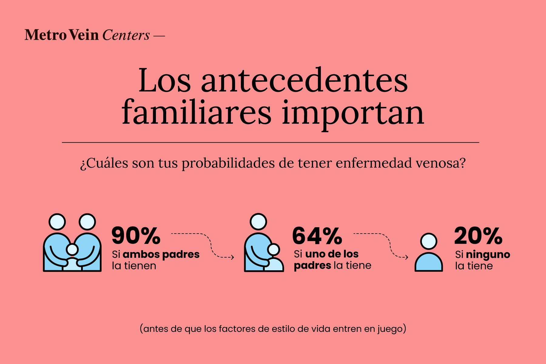 Es común observar enfermedades venosas similares dentro de una misma familia, lo que sugiere un fuerte componente genético. Si tiene un familiar cercano que ha padecido varices o insuficiencia venosa crónica, es posible que tenga un mayor riesgo de desarrollarlas. Según un estudio realizado por Cornu-Thenard et al, si uno de los padres tiene varices, el riesgo de desarrollar la afección puede ser de hasta un 64%. Si ambos padres las presentan, el riesgo puede aumentar hasta un 90%. Incluso si ninguno de los padres tiene varices, todavía existe alrededor de un 20% de probabilidad de desarrollarlas.