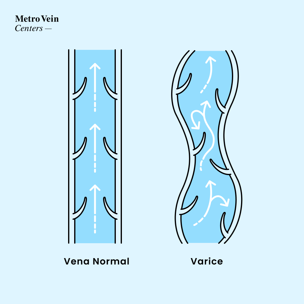 Cuando las venas se debilitan, las válvulas internas que regulan el flujo sanguíneo funcionan mal. Estas válvulas debilitadas hacen que la sangre se acumule dentro de la vena en lugar de desplazarse hacia el corazón y, a su vez, se producen venas abultadas y retorcidas llamadas venas varicosas o varices.