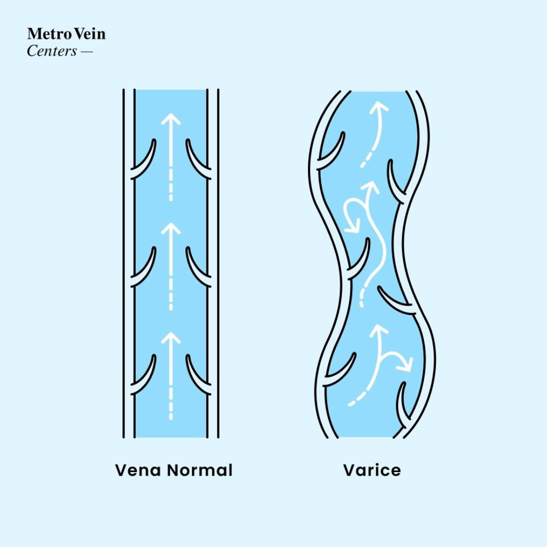 Las venas varicosas o varices son venas dilatadas, a menudo elevadas e hinchadas, de color azul, morado o rojo. Se forman debido a un mal funcionamiento de las válvulas de las venas que provoca un flujo sanguíneo deficiente, y pueden ser bastante dolorosas. Los tipos de varices que pueden necesitar tratamiento se dan con mayor frecuencia en las piernas, donde la sangre es bombeada constantemente en sentido vertical a través de válvulas unidireccionales. Cuando la enfermedad venosa progresa esas venas ahora dañadas acumulan sangre que no puede circular, lo que provoca una acumulación de presión, sangre estancada y un aumento de líquido en las piernas. Esto provoca calambres, pesadez y dolor en las piernas.