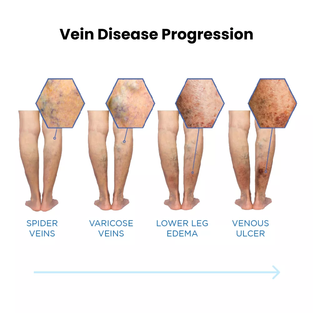 Varicose and spider veins are often a visible symptom of an underlying medical condition known as vein disease. Vein disease is a progressive disease, one where symptoms worsen over time. If left untreated, you might develop more serious issues down the road, including ulcers and blood clots. Luckily, vein treatment is easy and covered by most insurance.